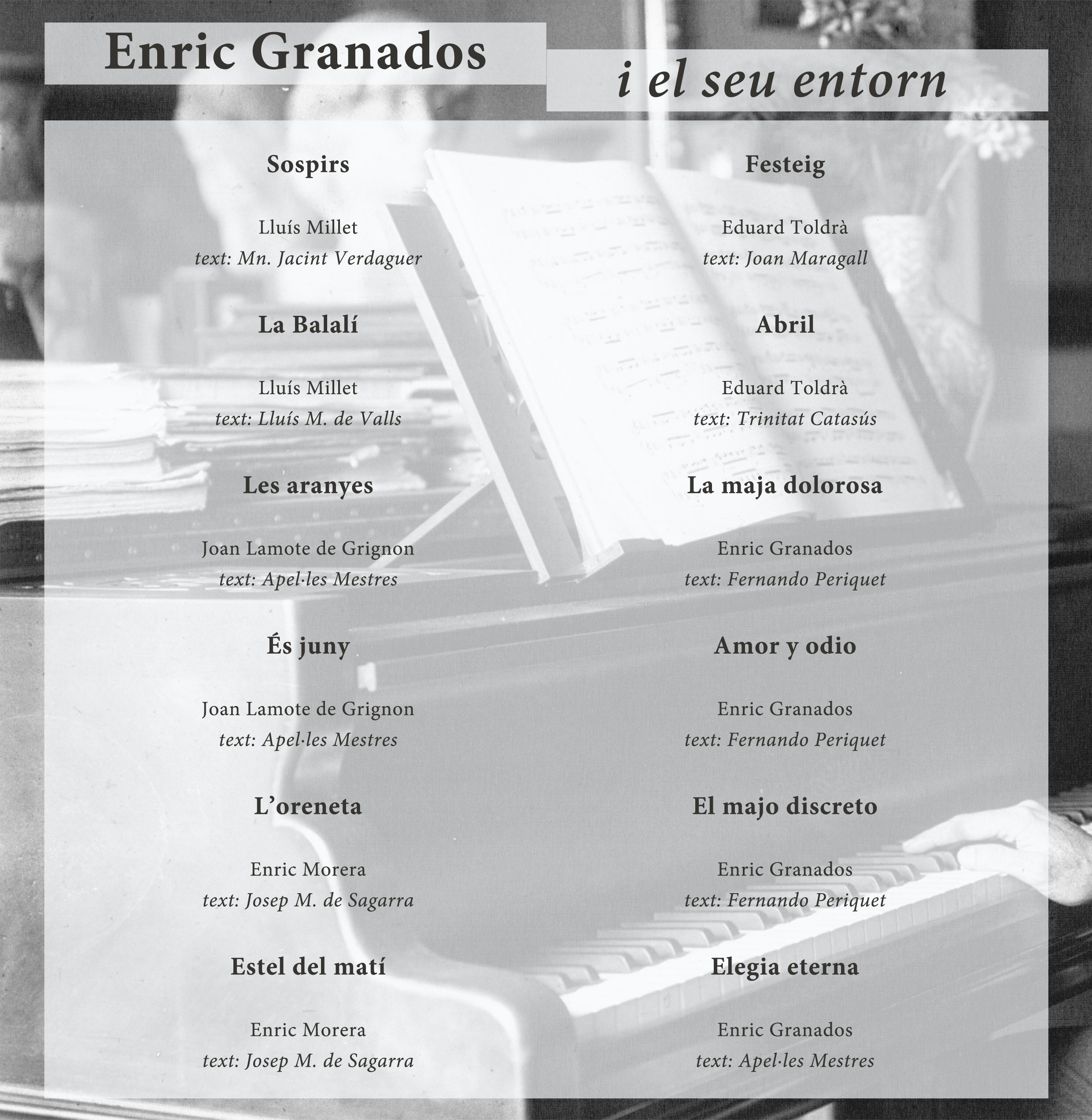 En aquest recital la soprano M. dels Àngels Miró acompanyada per la pianista M. Rosa Ribas interpretaran cançons d’Enric Granados i també dels seus contemporanis Lluís Millet, Joan Lamote de Grignon, Enric Morera i Eduard Toldrà. Tots ells van viure la plenitud del modernisme, juntament amb el pintor Ramon Casas, del qual celebrem enguany el 150è aniversari del seu naixement amb una exposició al nostre museu.